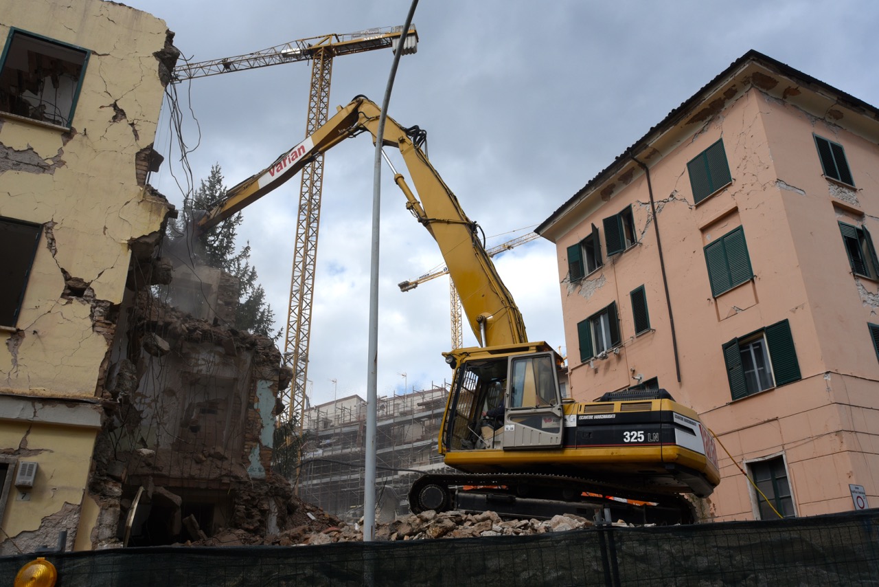 E' partita da un paio di giorni la demolizione dei grandi edifici residenziali, ex alloggi dell'edilizia popolare, in via Fontesecco all'Aquila.