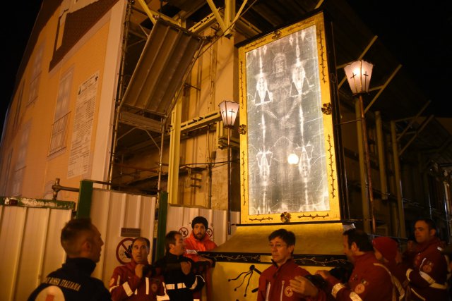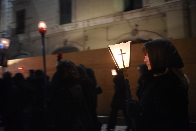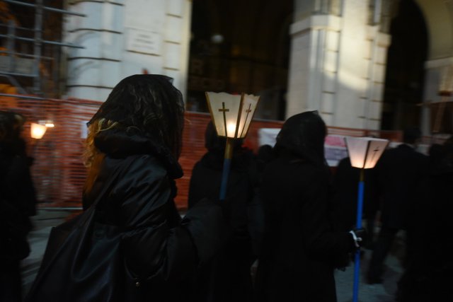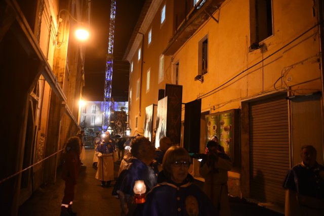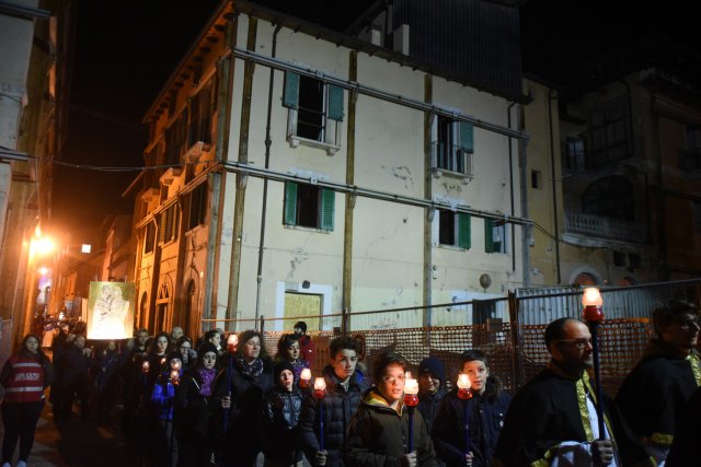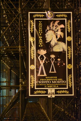 Ponteggi, puntellamenti, persone, fiaccole. E' un connubio di freddo silenzio e viva emozione la processione del venerdì santo, per le vie del centro storico dell'Aquila. A due settimane dal settimo anniversario del terremoto del 6 aprile 2009.