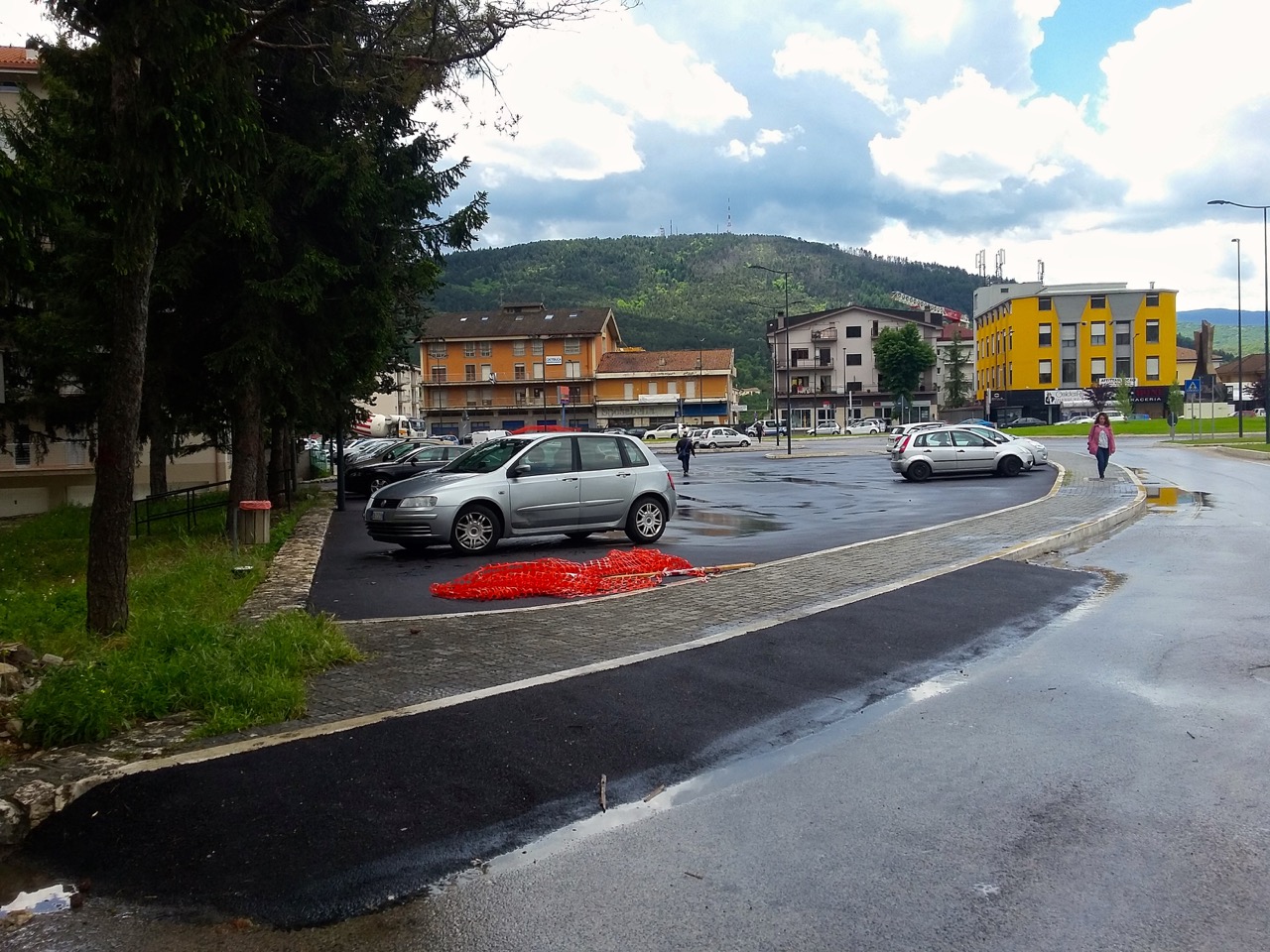 Una strada costruita appena un paio d'anni fa, che per mesi - e fino all'ultimo risolutivo intervento di Gran Sasso Acqua - alle prime gocce di pioggia si è allagata come una piscina olimpionica. Un progetto (oggi di fatto stravolto) privo di un consistente numero di parcheggi, che ha costretto alla realizzazione dei box a raso "provvisori" disegnati stamane, con la conseguente riduzione di una delle carreggiate a una sola corsia.