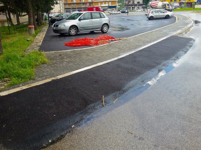 pezza piazzadarmiUn errore grottesco e grossolano, considerando che da quando il parcheggio è aperto si è creata di fatto un'altra entrata/uscita alla rotatoria (la quinta), con conseguenze per la sicurezza stradale e per il traffico. Anche qui l'amministrazione, solo oggi, ha dovuto letteralmente metterci una pezza. Come è evidente nelle foto, infatti, gli operai comunali hanno dovuto stendere l'asfalto necessario a creare una rampa sul marciapiede, per consentire l'uscita dei veicoli dal parcheggio, in direzione viale Beato Cesidio (verso Santanza, per intenderci), come era normale che fosse.