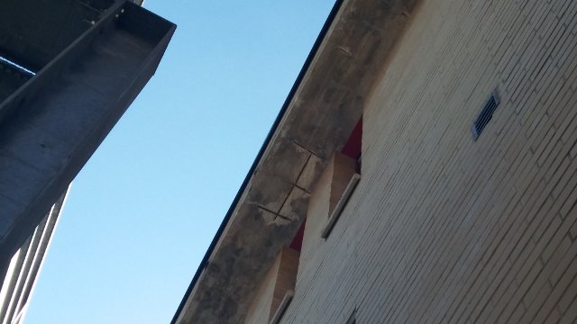 Sul posto sono intervenuti i vigili del fuoco, che hanno provveduto a transennare l'area. Stando a quando appreso, il distacco non sarebbe stato provocato dalle scosse di terremoto di questi giorni ma da calcestruzzo ammalorato, sbriciolatosi, probabilmente, a causa di un aumento di volume dovuto alla formazione di ruggine. La rottura ha lasciato scoperti i ferri dell'armatura del cornicione (foto).