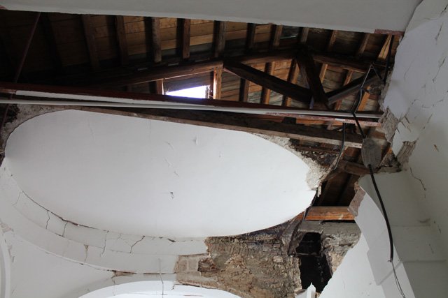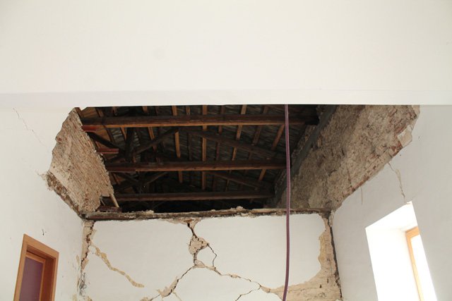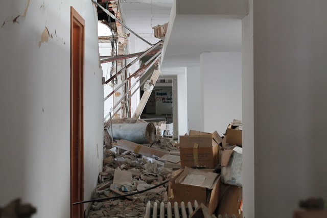 I danni causati dal terremoto sono ingenti: in alcuni punti alcune vecchie volte in mattoni sono venute giù, lasciando cumuli di macerie. Il tetto, però, forse perché di legno, è rimasto al suo posto. La parte più malmessa sembra essere proprio quella che affaccia su via Maiella, dove infatti è stato necessario intervenire con puntellamenti significativi; ma lesioni e crepe sono localizzate un po' ovunque. Nel complesso, tuttavia, l'edificio – un corpo architettonico davvero imponente, con un piano strada e altri tre interrati – forte, forse, anche dell'intervento di ristrutturazione che era iniziato prima del terremoto, sembra aver retto.