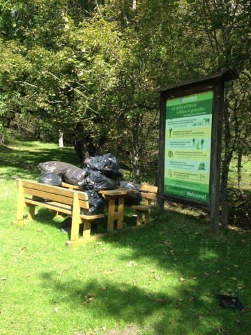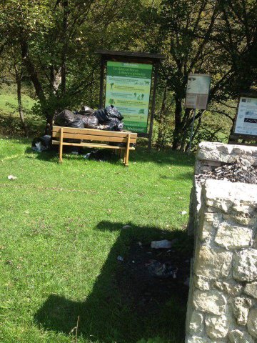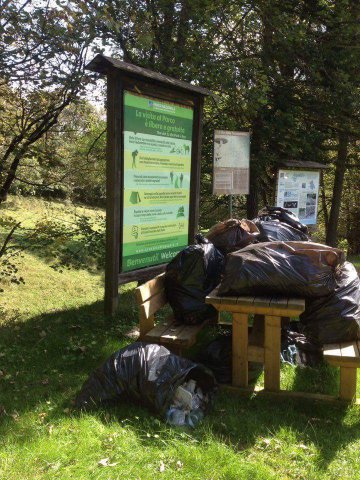 Ci è stato fatto notare che non ci sono cestini o cassonetti in quell’area e questa è una scelta voluta e dovuta, siamo in area Parco e gli stessi potrebbero essere presi di mira da vari animali, ma, il cartello sopra al cumulo di sacchi di rifiuti riporta una frase molto chiara “Non lasciare traccia del tuo passaggio”.