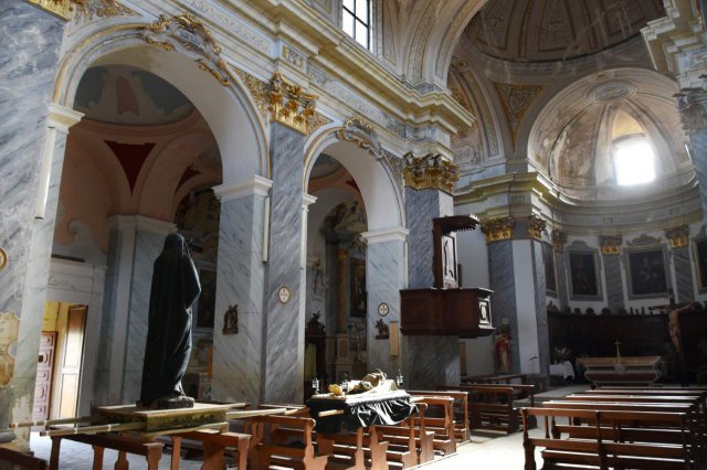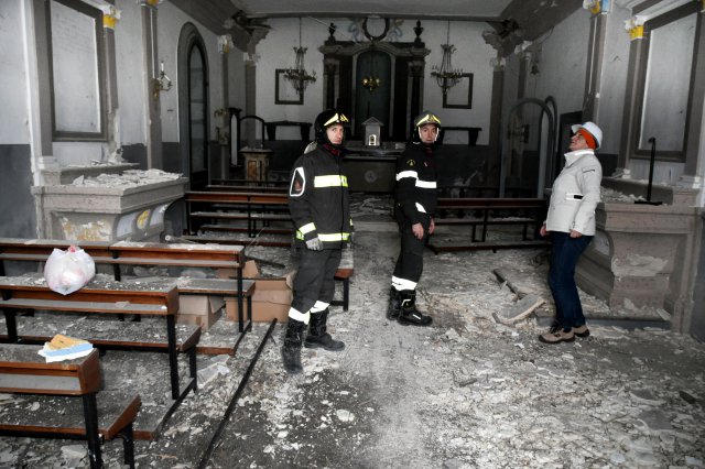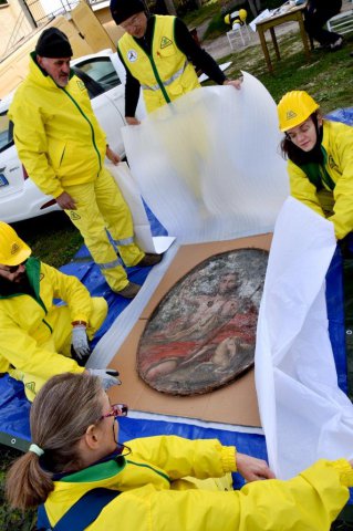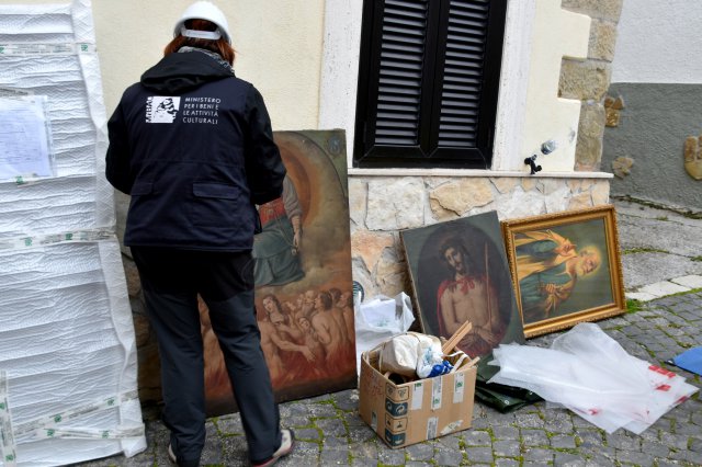 Alla presenza dei Carabinieri del Nucleo Tutela del Patrimonio culturale di Ancona, un funzionario storico dell’arte e altre due unità del Segretariato Regionale dei Beni culturali, coadiuvati da una squadra dei Vigili del Fuoco e da un gruppo di volontari di Legambiente (che ha messo a disposizione i mezzi di trasporto), hanno prelevato 101 opere tra tele, sculture, arredi sacri e paramenti, trasferiti presso il deposito dell’Arcidiocesi dell’Aquila.