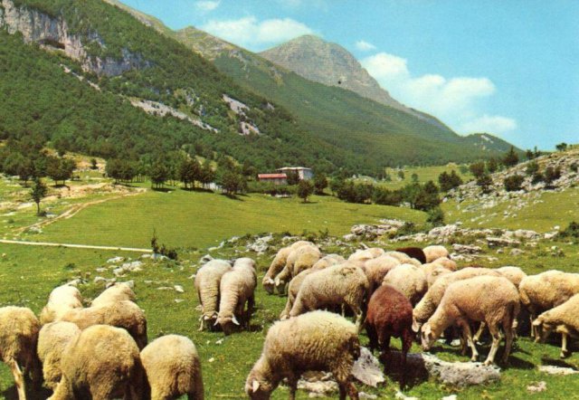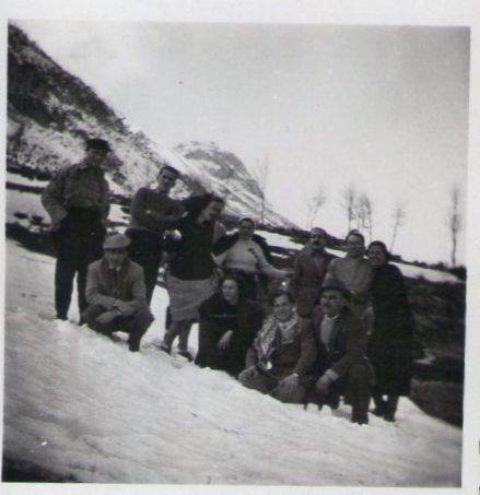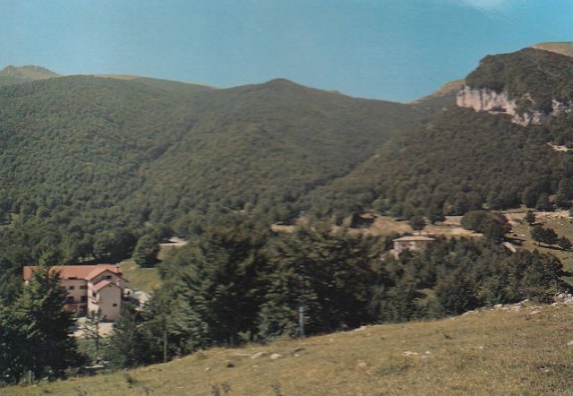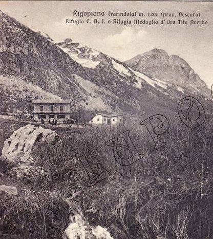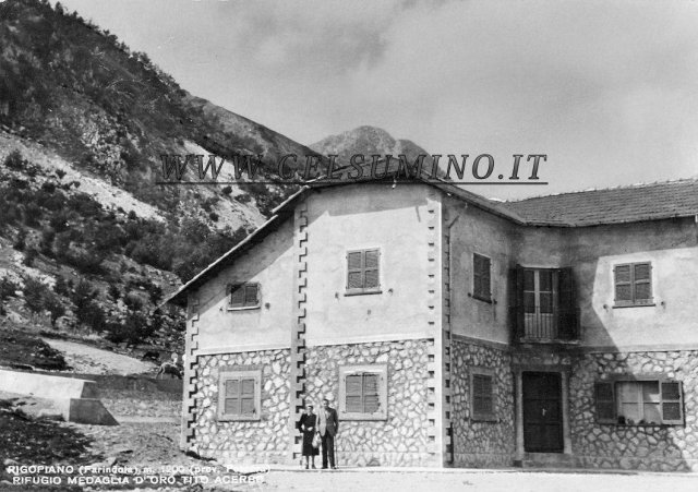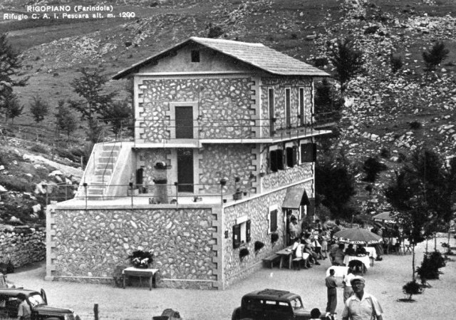 Un gruppo di persone nei pressi della struttura datata 1950, le foto dell'incantevole natura ai piedi del Gran Sasso, scatti dell'albergo Rigopiano in estate e foto del rifugio intitolato alla medaglia d'oro al valor militare Tito Acerbo.