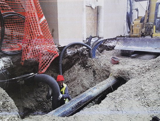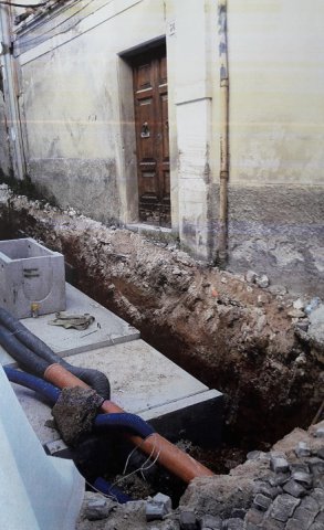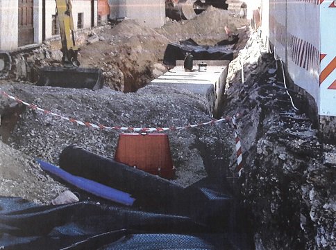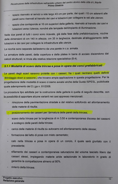Corti ha mostrato il progetto esecutivo per la realizzazione degli interventi [a sinistra, clicca sull'immagine per allargare] che stabilisce come "le pareti degli scavi" debbano essere "protette con i casseri", delle paratie in altre parole, "per l'armatura della trincea"; ebbene, "in centro storico non si sono mai visti", ha sottolineato l'avvocato aquilano.