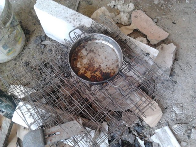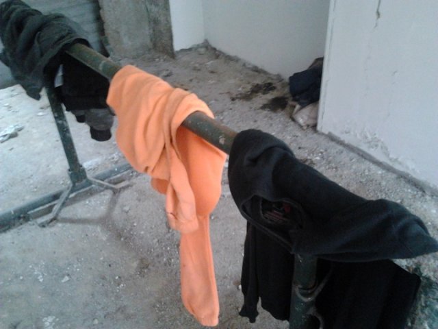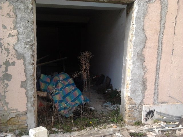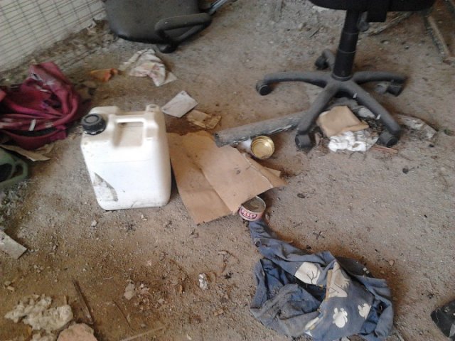 Una pentola dal fondo nero e incrostato, scatolette di tonno aperte, buste di plastica, bottiglie e lattine di birra vuote, indumenti da lavoro appesi su ponteggi da cantiere, coperte e materassi ricoperti di sudiciume, cumuli di immondizia, escrementi umani.