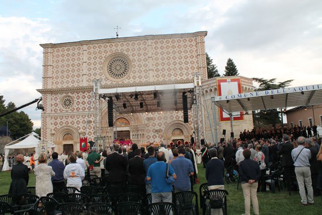 Celebriamo la solennità della Perdonanza Celestiniana nel 720° anniversario dell’incoronazione di papa Celestino V. Questo personaggio storico è ricordato, oltre che per il gesto delle sue dimissioni, gesto di grande umiltà e responsabilità, imitato ai nostri giorni da papa Benedetto XVI, soprattutto per la lunga vita di preghiera, rigorosa ascesi e solitudine come monaco eremita, e inoltre per la Bolla del Perdono, con cui concedeva l’indulgenza plenaria a chiunque, debitamente disposto, visitasse questa basilica di S. Maria di Collemaggio nella festa del Martirio di S. Giovanni Battista.