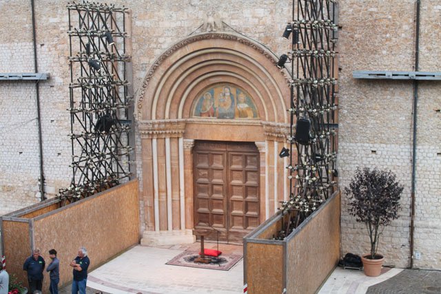 La porta santa, che verrà aperta al termine della Messa, è simbolo di Cristo. E’ porta della speranza; via soprattutto verso il Padre e la vita eterna, ma anche via verso un futuro prossimo di ricostruzione e di progresso, di rinnovamento civile ed ecclesiale.