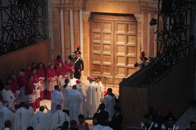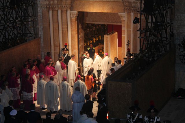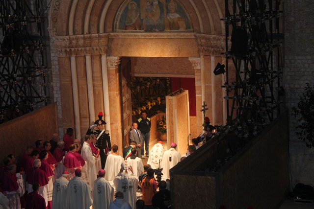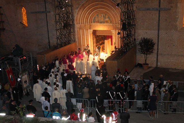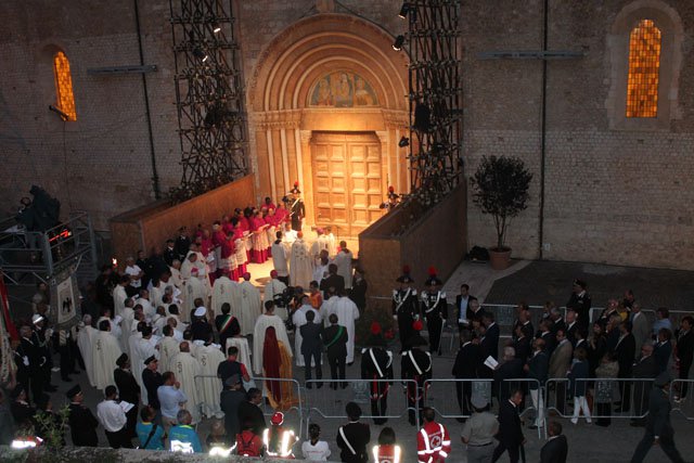 Il Signore Gesù ci rivela l’amore del Padre, ci attrae a sé con la forza dello Spirito Santo, ci converte e ci conduce al Padre come figli. Ecco perché nel Vangelo, che stasera abbiamo ascoltato, ci dice: “Io sono la porta: se uno entra attraverso di me, sarà salvato … Io sono venuto perché abbiano la vita e l’abbiano in abbondanza” (Gv 10, 9). E’ una promessa di vita vera e in pienezza; un invito pressante a entrare con Cristo, come suoi discepoli e fratelli, nella famiglia del Padre, per vivere come veri figli di Lui. Da parte sua, S. Pietro Celestino fa eco all’appello del Signore Gesù e ci chiama a celebrare la Perdonanza con una reale conversione del cuore, con nuovi atteggiamenti e comportamenti, personali, ecclesiali, sociali. Ci sollecita a entrare per la porta santa, non tanto nella basilica, che purtroppo è disastrata e ancora inaccessibile, ma piuttosto nella comunità ecclesiale e nella comunità civile, con forte spirito di responsabilità, solidarietà e operosa collaborazione. Ci esorta con lo stesso affetto appassionato di S. Paolo, che, come abbiamo ascoltato poco fa nella II lettura, scriveva ai cristiani di Corinto: “Vi supplichiamo in nome di Cristo: lasciatevi riconciliare con Dio” (2Cor 5, 20).