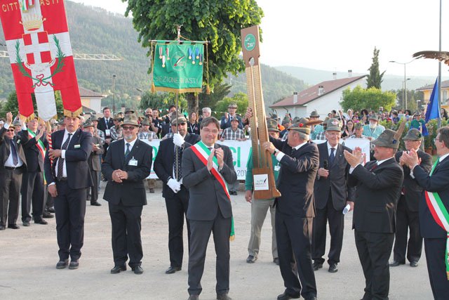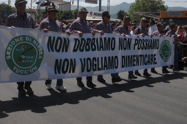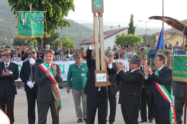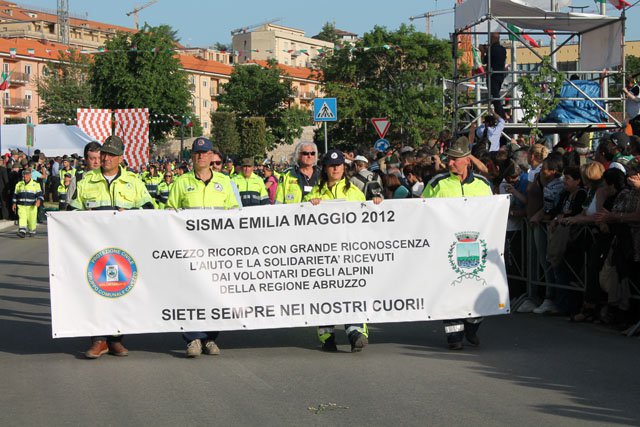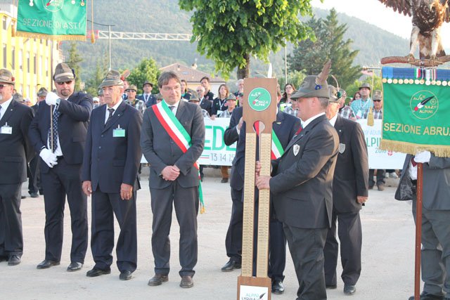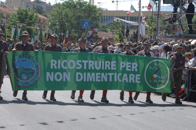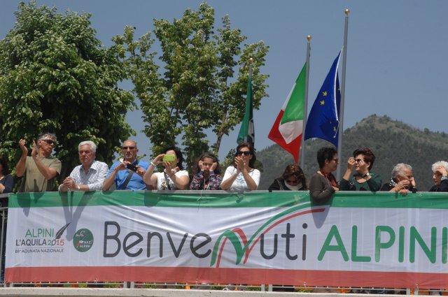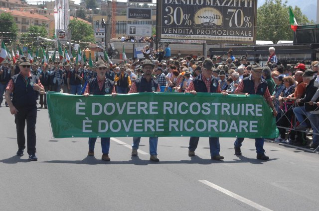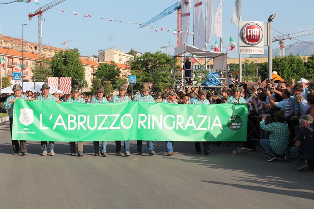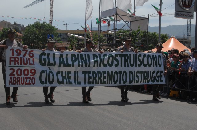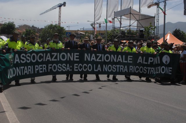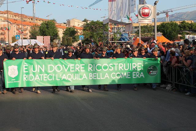 Il corteo è stato aperto dal tricolore del Nono reggimento alpini, bandiera di guerra scortato dalle compagnie in armi. Lo striscione di apertura recitava "Alpini: il ricordo, la ricostruzione, il dolore". Tanti gli striscioni che fanno riferimento al "dovere" della ricostruzione dell'Aquila e al ricordo del terremoto di sei anni fa.
