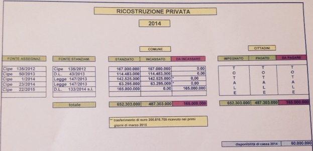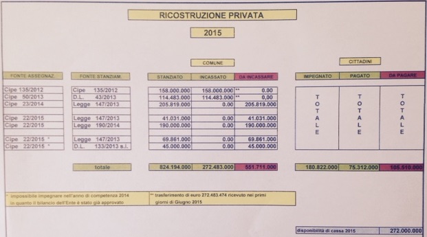L'audizione è stata occasione per fare un punto sugli stanziamenti della ricostruzione privata, al 30 giugno 2015. Dal 2009 ad oggi, lo Stato ha assegnato al bilancio del Comune dell'Aquila per competenza annuale 4miliardi e 323milioni. Le somme che sono state effettivamente trasferite dalla Tesoreria dello Stato alla Tesoreria del Comune ammontano a 3miliardi e 607milioni: dunque, restano da incassare 716milioni di euro.