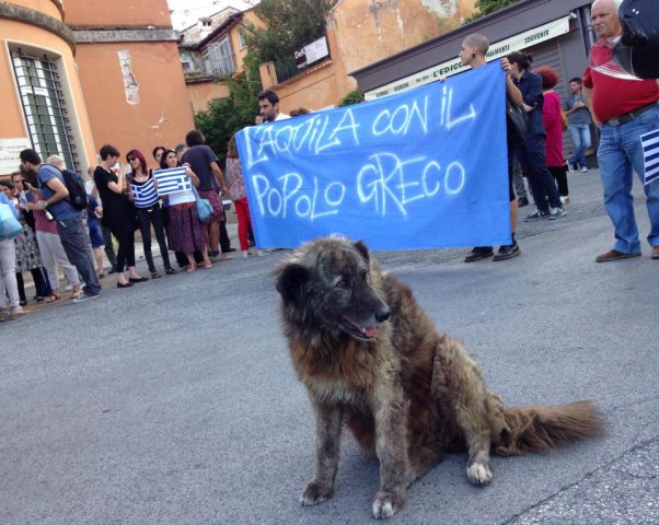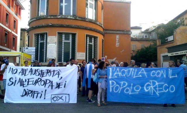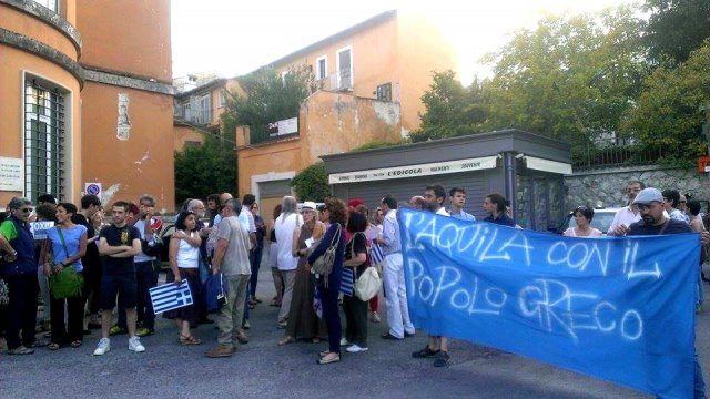 Oltre centocinquanta persone hanno partecipato all'Aquila al presidio indetto da 3e32 / CaseMatte, Appello per L'Aquila e Arcigay in solidarietà con il popolo greco, in vista del referendum che si terrà nel paese ellenico domenica prossima.