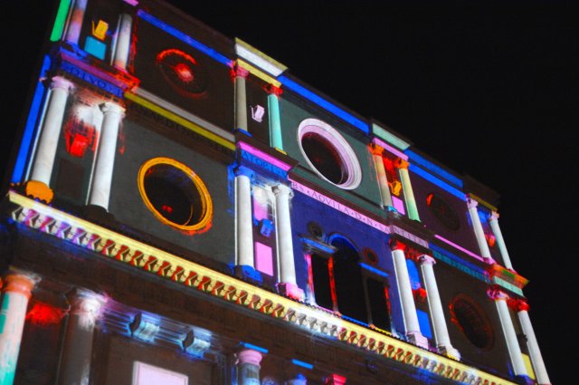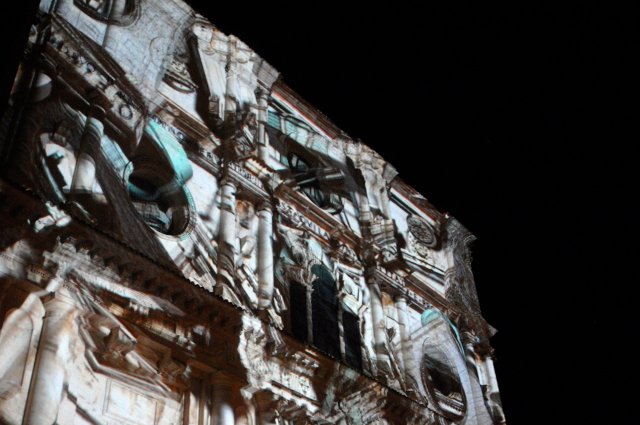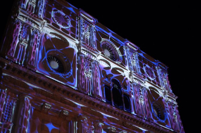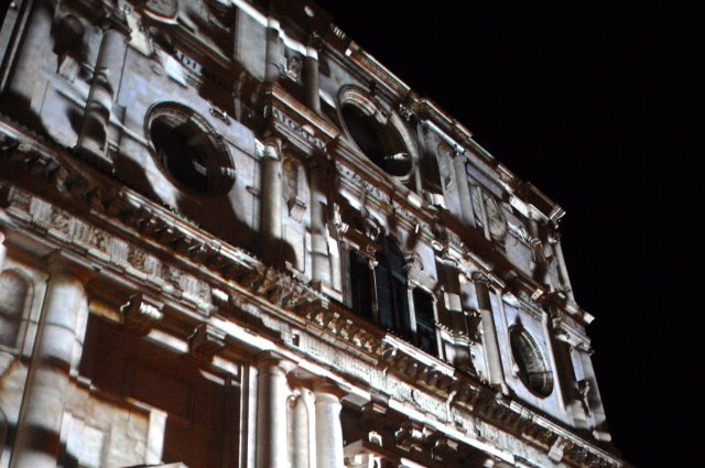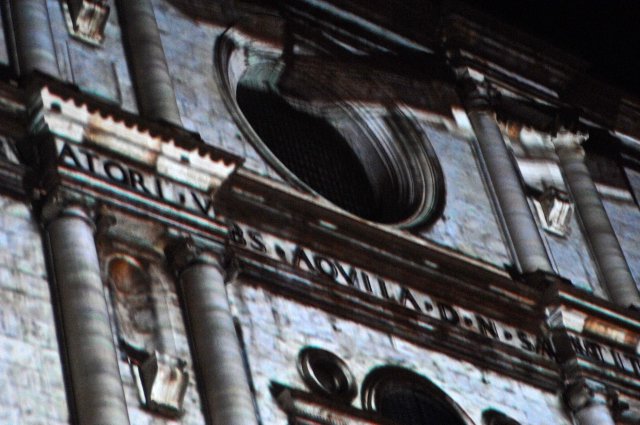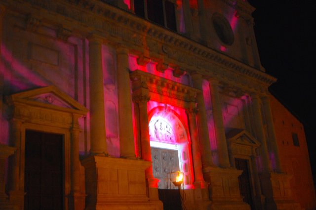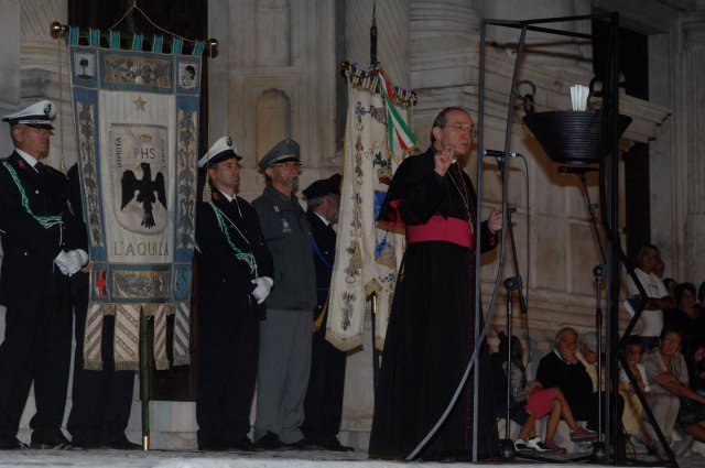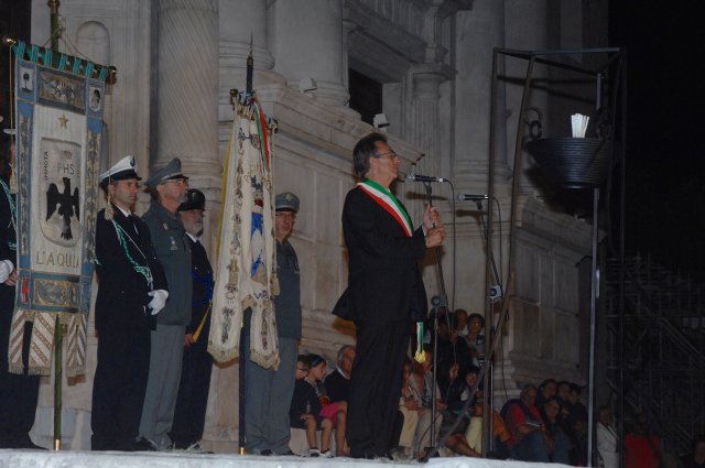 Nell'inconsueto scenario della scalinata della Basilica di San Bernardino - ridonata alla città qualche mese fa - si è svolta la cerimonia solenne, essendo inadeguata Piazza Palazzo, in quanto invasa da alcuni cantieri della ricostruzione. L'appuntamento ha preceduto giochi di luci e suoni davvero particolari e suggestivi.