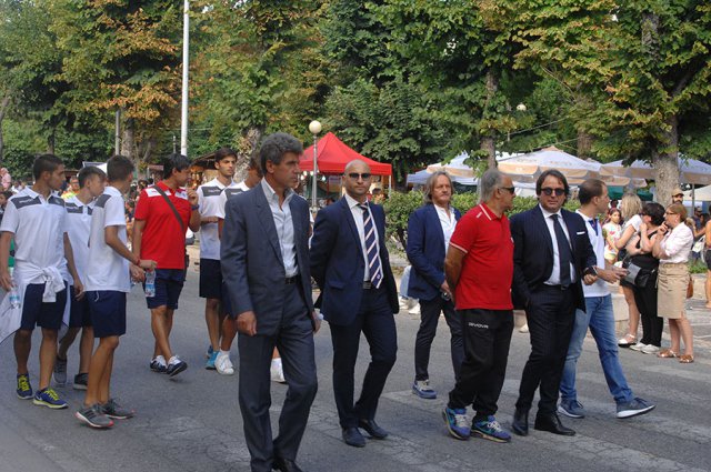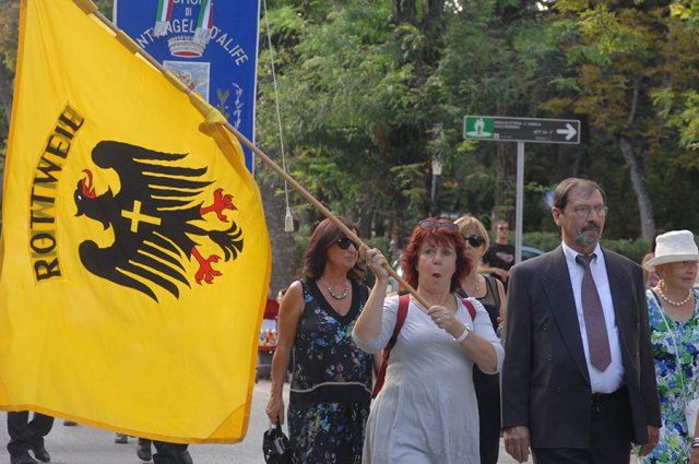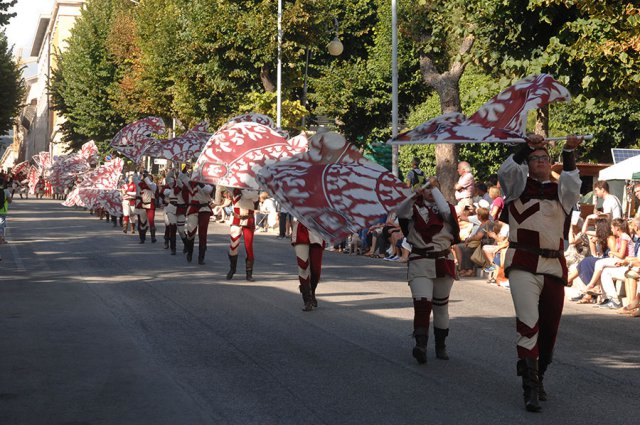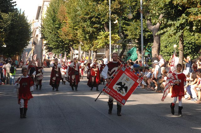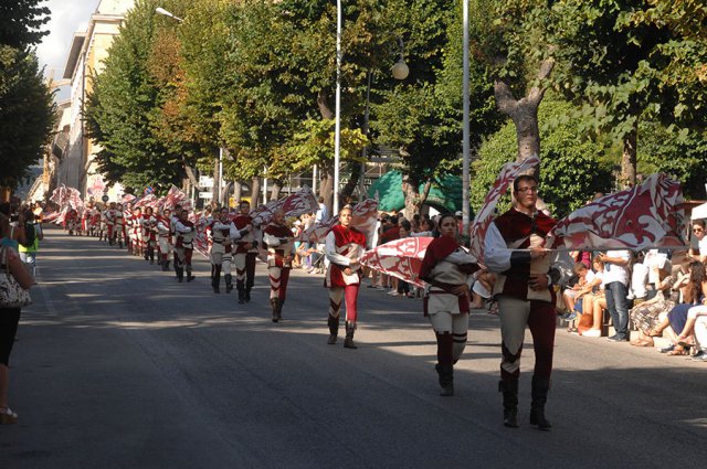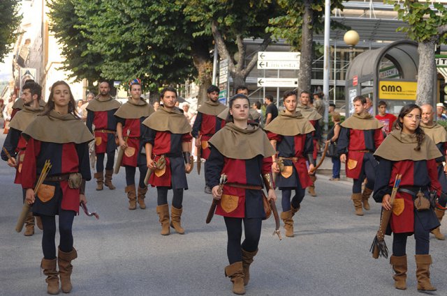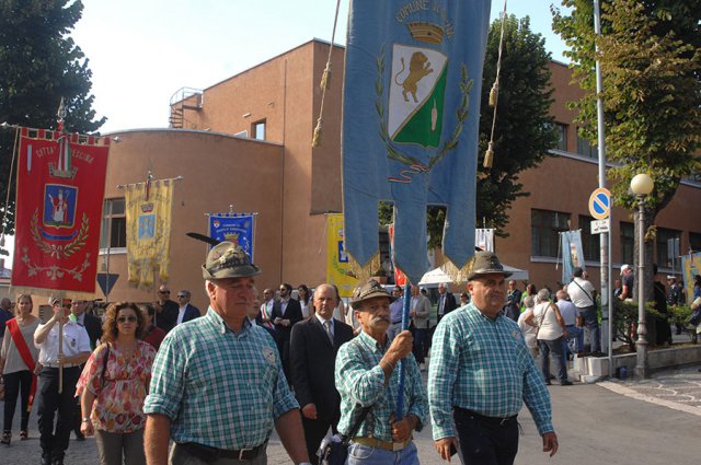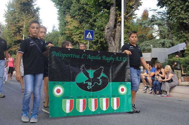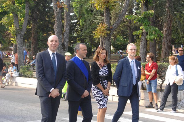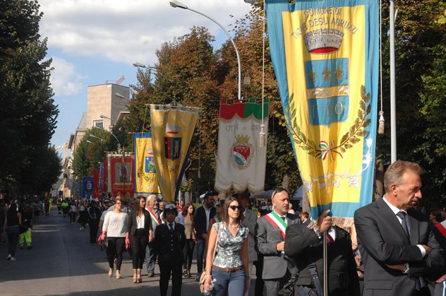 Come di consueto, il Corteo era diviso in due parti. Le autorità civili, con in testa il gonfalone della città dell’Aquila, si sono messe in cammino alle 16 da Palazzo Fibbioni, seguendo un percorso che si è snodato lungo corso Vittorio Emanuele, piazza Duomo, corso Federico II, viale Crispi e viale Collemaggio. Il gonfalone è stato scortato da tre agenti di polizia municipale in alta uniforme, dal vicesindaco Nicola Trifuoggi, dal capo di gabinetto del Comune Mauro Marchetti, dal segretario generale Carlo Pirozzolo e dai dirigenti comunali. A seguire, il gonfalone di Regione Abruzzo con il presidente della Giunta, Luciano D'Alfonso, il vice Giovanni Lolli e i consiglieri. Dunque, il gonfalone della Provincia, con il presidente Antonio De Crescentiis e i rappresentanti l'assise provinciale. E ancora, hanno sfilato il rappresentante ufficiale del Governo, il sottosegretario agli Esteri Mario Giro, il prefetto dell’Aquila Francesco Alecci, il vice presidente del Consiglio superiore della magistratura Giovanni Legnini, il questore Alfonso Terribile, i parlamentari abruzzesi, l’ex sottosegretario Gianni Letta.