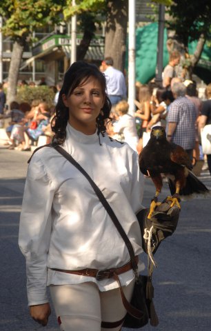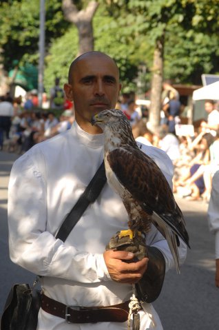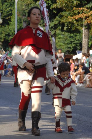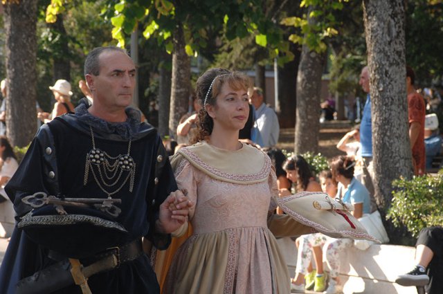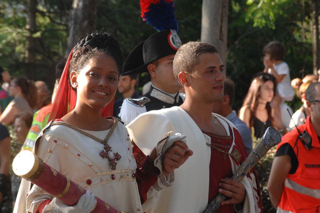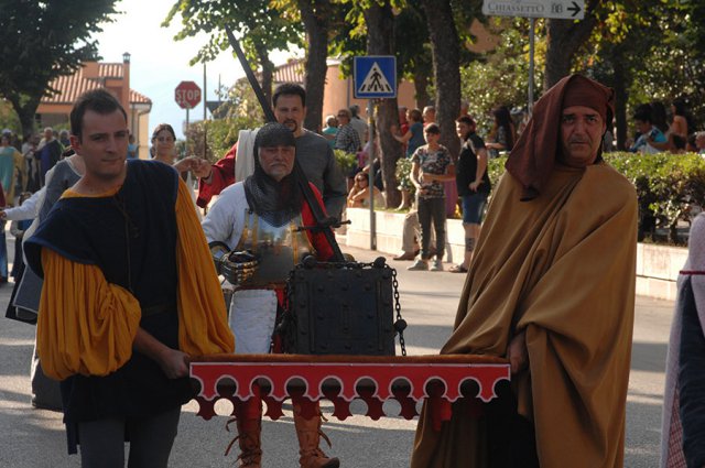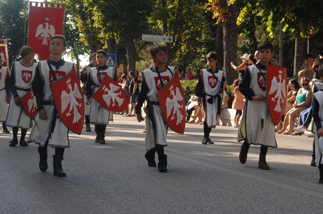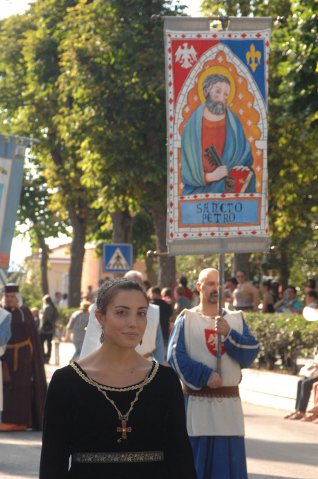 Al termine del corteo civile, è partito, da San Bernardino, il corteo storico con in testa il sindaco, seguito da oltre 800 figuranti. A indossare l'abito della Dama della Bolla è stata Roxana Alejandra Oliveros Garcia, trent’anni, venezuelana nata a Caracas. In corteo non è stato portato il documento originale, che, dopo il restauro del 1997 (da allora è custodito in una teca), si trova attualmente all’Expo di Milano, esposto nel Padiglione Italia, area Eataly, dove resterà fino al 31 ottobre all’interno della mostra “Il Tesoro d’Italia” curata da Vittorio Sgarbi. Il Giovin signore è invece Mirko Schiavone, ventunenne aquilano allievo della scuola sottufficiali della Guardia di Finanza. A lui è stato affidato il compito di portare il ramo d’ulivo del Getsemani con il quale il cardinale Beniamino Stella ha "bussato" tre volte per l'apertura della Porta Santa. Elisa Piccirilli, studentessa 18enne del liceo di Scienze Umane, ha impersonato invece la Dama della Croce, indossando un magnifico gioiello realizzato dall’artista aquilana Laura Caliendo.