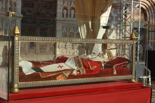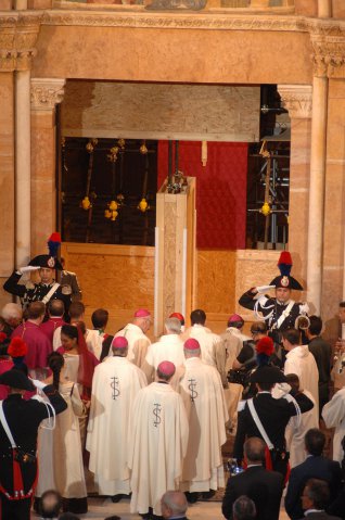 La teca contenente le spoglie di San Celestino V è sistemata sul palco montato all’esterno, sul sagrato della basilica.