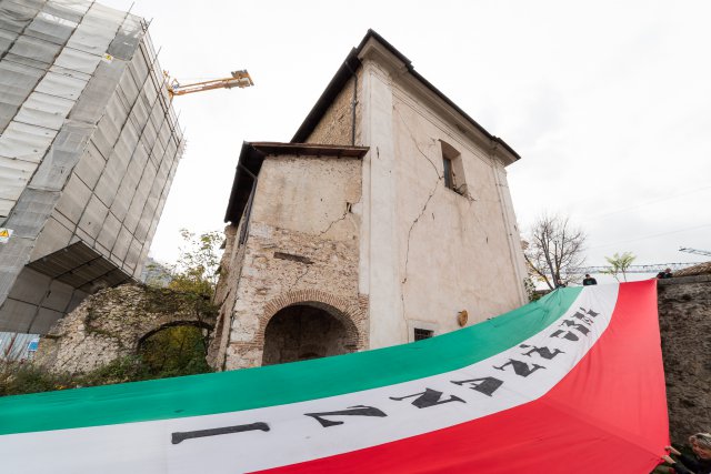 Un "flash mob", quello degli attivisti del Gruppo, per sensibilizzare autorità, enti preposti e opinione pubblica sulla necessità di salvaguardare la chiesa pesantemente danneggiata dalla scossa di domenica scorsa, 30 ottobre. La chiesa si trova nelle vicinanze del sito di Porta Barete, è priva di messa in sicurezza, e interessata anche da vicini cantieri di riparazione di edifici privati.