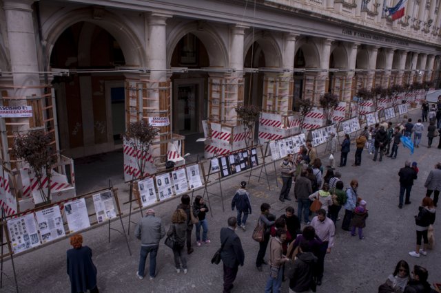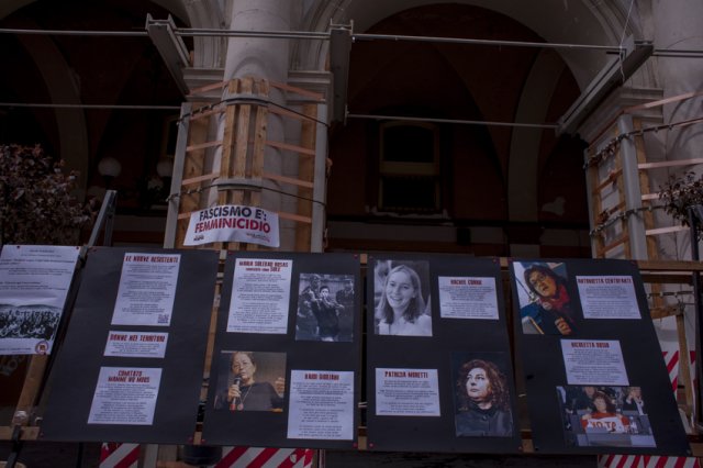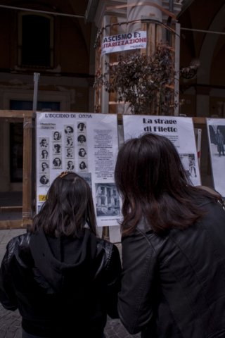 Intanto, la nuova rete antifascista aquilana parlava tramite l'affissione di vari striscioni – apparsi ovunque in centro storico - di vecchi e nuovi fascismi, ricordando la militarizzazione subita durante la fase dell'emergenza post sismica, il divieto di assemblee, le denunce ai manifestanti aquilani e il sequestro delle carriole, ma anche il femminicidio e le violenze private.
