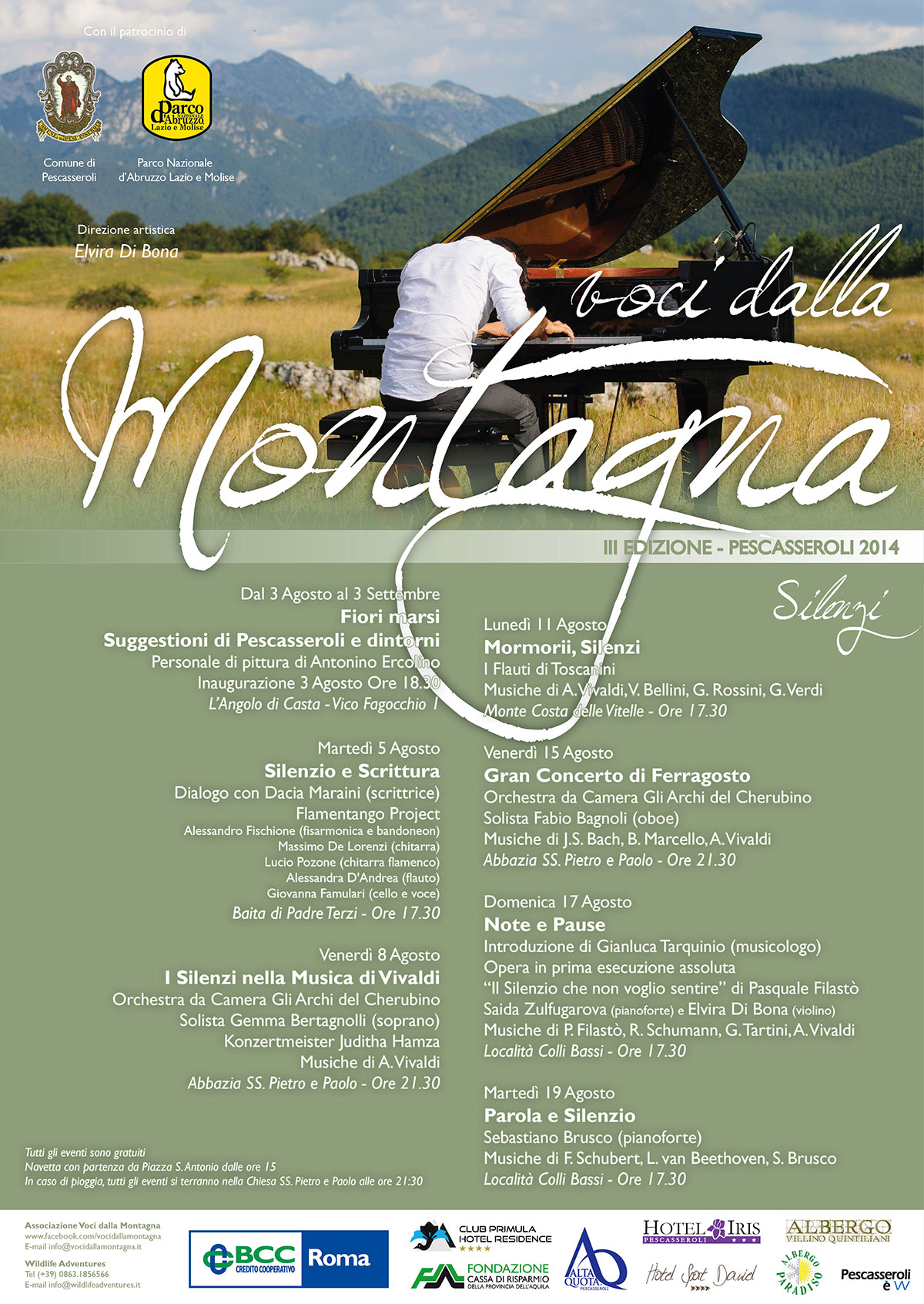 Come nelle passate edizioni la peculiarità del Festival sarà quella di poter assistere a concerti di grande qualità nei luoghi più belli del Parco Nazionale d'Abruzzo come Baita di Padre Terzi, Monte Costa delle Vitelle e prato dei Colli Bassi. E quest'anno il Festival avrà per tema il silenzio, inteso come momento di intima riflessione personale e diventato ormai un lusso per chi vive in città, e che solo luoghi come Pescasseroli possano restituire.
