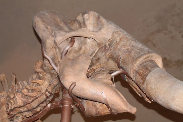Durante il primo restauro negli anni ’50 il cranio era stato modellato in modo del tutto arbitrario, eccedendo di circa 5 centimetri l’altezza reale della volta cranica. Il lato destro e la sua parte posteriore, mancanti sono state dunque rimodellate e oggi il cranio risulta più proporzionato e in linea con le caratteristiche della specie Mammuthus meridionalis. Sull’alveolo della difesa sinistra (zanna mancante), un’estesa stuccatura aveva nascosto una profonda ferita nell’osso, interessata da una patologia conseguente un importante evento traumatico. Il contesto di ricrescita di nuovo tessuto osseo attorno alla ferita è oggetto di uno studio specialistico condotto con l’ausilio di radiografie e analisi di microcampioni.