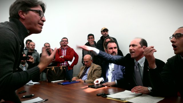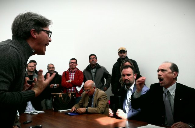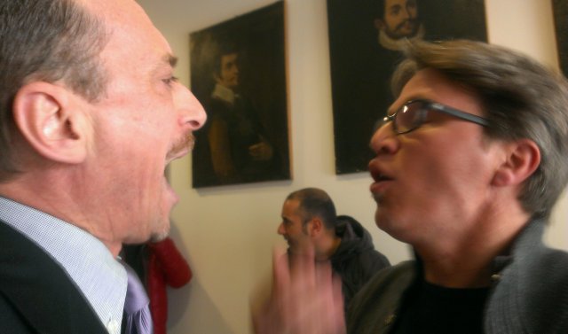 E' stata una conferenza stampa a dir poco concitata quella convocata oggi da alcuni esponenti dell'opposizione comunale. A condurre l'incontro è stato il consigliere comunale di L'Aquila città aperta Giorgio De Matteis, che durante e dopo la conferenza stampa si è intrattenuto in un acceso battibecco con alcuni dei circa 40 lavoratori dell'ex polo elettronico dell'Aquila. Presenti anche Guido Liris, Emanuele Imprudente e Luigi D'Eramo.