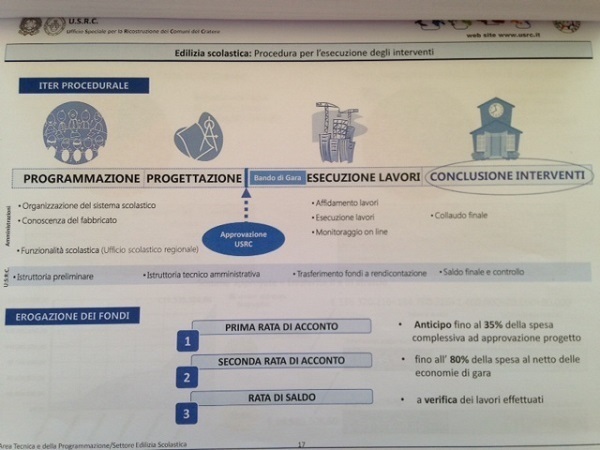 E torniamo nel merito della ricostruzione. All'USRC di Paolo Esposito, è stato delegato il compito di completare il secondo piano stralcio (che riguarda la messa in sicurezza delle scuole di pertinenza della Provincia dell'Aquila fuori cratere, in particolare a Sulmona e Avezzano) e la realizzazione del terzo piano stralcio (escluso, giusto ripeterlo di nuovo, il Comune dell'Aquila).