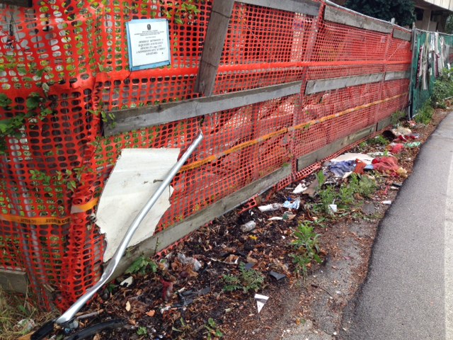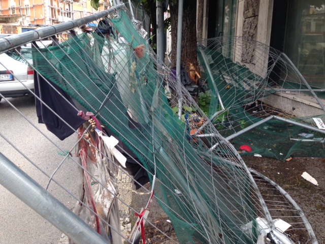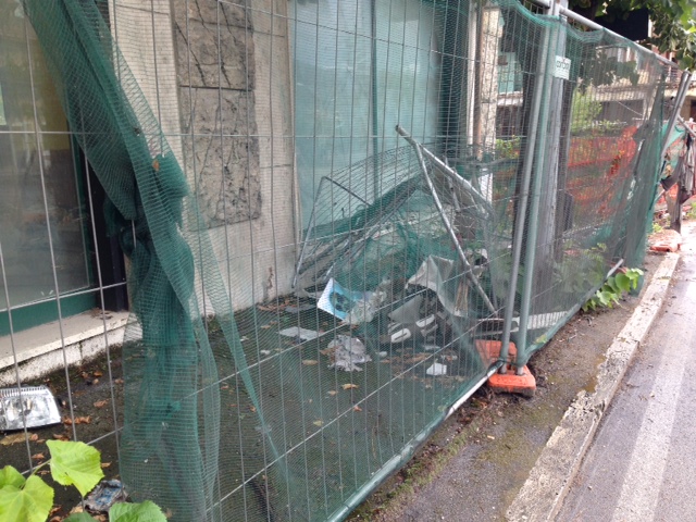 L'Aquila, Via XX Settembre - Succede anche questo nel capoluogo abruzzese. Una parte delle transenne di fronte la Casa dello Studente, dove il 6 aprile 2009 morirono otto ragazzi, sono state divelte e buttate a terra. Da anni quelle transenne sono divenute un vero e proprio muro della memoria, sul quale sono appese foto, messaggi e oggetti cari agli studenti deceduti. Al momento, non è ancora chiara la causa di questo piccolo - quanto indecente - 'crollo' della memoria e del rispetto. Opera di vandali? Del vento? Di un incidente d'auto? Oltre le transenne, infatti, è presente uno specchietto retrovisore. Di certo però quella grata gettata per terra è un'onta che si aggiunge pesantemente al degrado già presente in città. (Ale.Tet.)