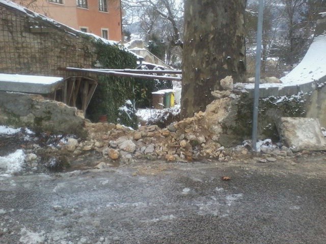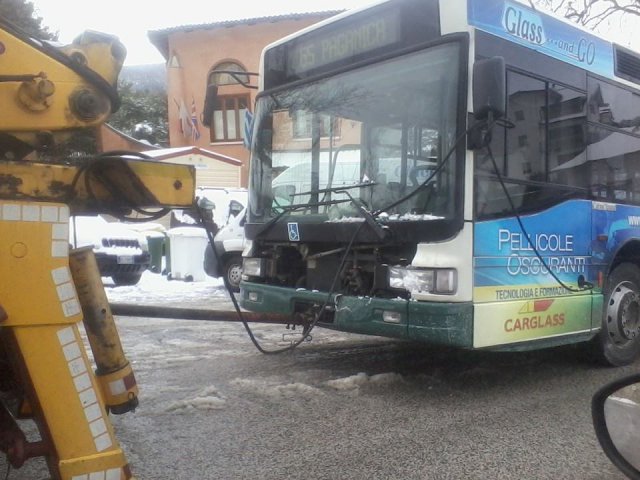 Il maltempo che si è abbattuto oggi sull'Aquila sta provocando disagi su molte strade, per la presenza di neve e soprattutto di ghiaccio. Nella foto, scattata sulla s.s. 17 est in prossimità del bivio per la frazione S. Elia, si vede un autobus dell'Ama finito contro un muretto di cemento a causa del fondo stradale reso insidioso dal ghiaccio. L'incidente non ha provocato feriti.