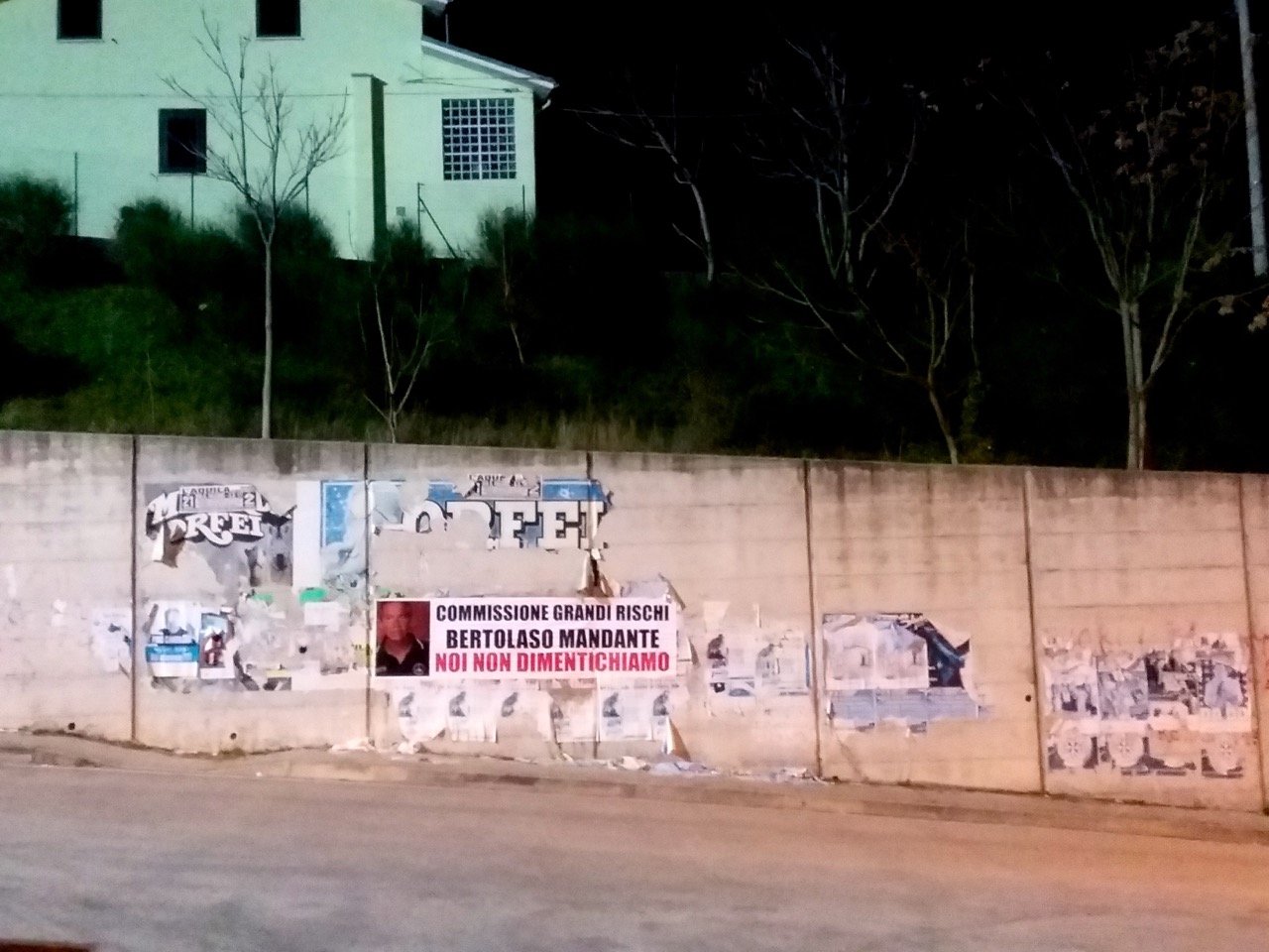 I lunghi manifesti sono stati affissi in occasione dell'inizio del processo cosiddetto Grandi Rischi bis, nel quale Bertolaso è imputato per omicidio colposo plurimo, in relazione alla convocazione della Commissione Grandi Rischi del 31 marzo 2009. Per la cronaca, il processo è stato rinviato al 4 marzo.