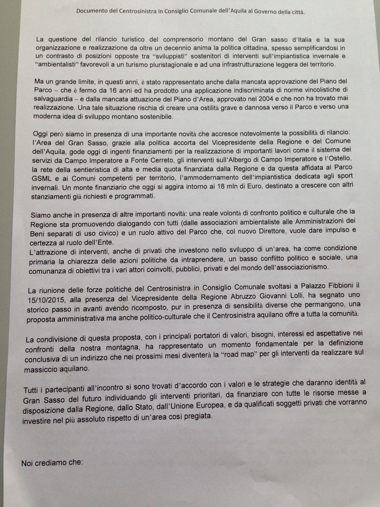 Pace fatta sul Gran Sasso, o almeno così si è detto. Oggi infatti il Centro sinistra - da Enrico Perilli a Stefano Palumbo, Giustino Masciocco, Giuliano Di Nicola, Tonino De Paolis e l'assessore Pietro Di Stefano - si è presentato numeroso e unito in conferenza stampa per dire che è stato trovato finalmente il "punto d'incontro" per spendere i "18milioni a disposizione sul Gran Sasso".