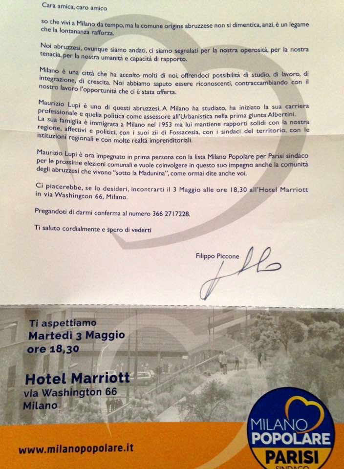 Poi, il finale: "Lupi è ora impegnato in prima persona con la lista Milano Popolare per Parisi sindaco e vuole coinvolgere in questo suo impegno anche la comunità degli abruzzesi che vivono sotto la Madunina, come ormai dite anche voi".