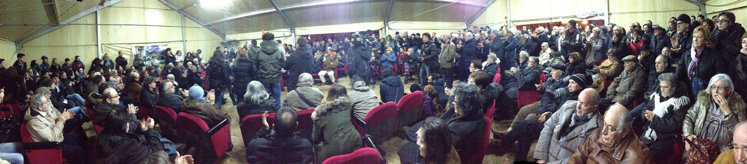 Oltre 500 persone hanno risposto all’invito di Apl, L’Aquila che vogliamo, 3e32, Assemblea cittadina e Consiglio civico aquilano, affollando il tendone per chiedere un cambiamento netto di persone e metodi, legittimato da un nuovo voto popolare. Nei minuti, assai concitati, in cui il sindaco Massimo Cialente rassegnava le dimissioni. Decisione accolta da un lungo applauso.