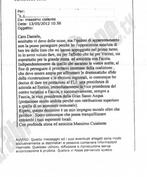 Nel caso di ballottaggio, in cambio dell'apparentamento a Cialente dell'aspirante sindaco Enrico Verini, sarebbero stati promessi ai candidati di Futuro e Libertà posti in giunta e cariche in enti in cui il Comune ha posti nei consigli direttivi.