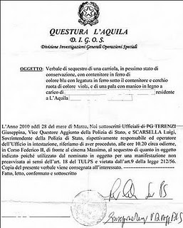 Il 1 luglio prossimo ci sarà la prima udienza sul "sequestro di carriole". Ricordiamo tutti il ridicolo verbale di sequestro con cui furono prese in custodia le carriole di tre attivisti, colpevoli di voler rimuovere le macerie della loro città. Il 15 luglio si terrà invece a Roma la terza udienza del processo per la manifestazione a Roma del 7 luglio 2010, in cui ci furono due feriti per le manganellate della polizia e fu impedito di manifestare a settemila aquilani. Il 26 luglio l'estate rovente continuerà con la prima udienza del processo contro i manifestanti che organizzarono il presidio di protesta del 9 novembre 2010, quando Berlusconi venne a L'Aquila a premiare Bertolaso. Questa accusa è particolarmente grave perchè si parla anche di "violenza privata", per aver ostacolato il passaggio dell'auto dell'ex vice-commissario Cicchetti.