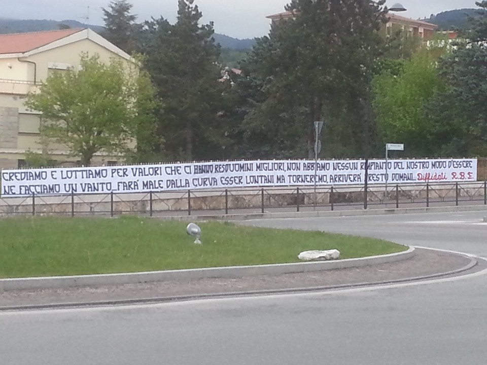 Nella foto sopra lo striscione appena esposto dai diffidati del gruppo Ultras dei Red Blue Eagles: "Crediamo e lottiamo per valori che ci hanno reso uomini migliori, non abbiamo nessun rimpianto del nostro modo d'essere ne facciamo un vanto...farà male dalla curva esser lontani ma torneremo, arriverà presto domani..."