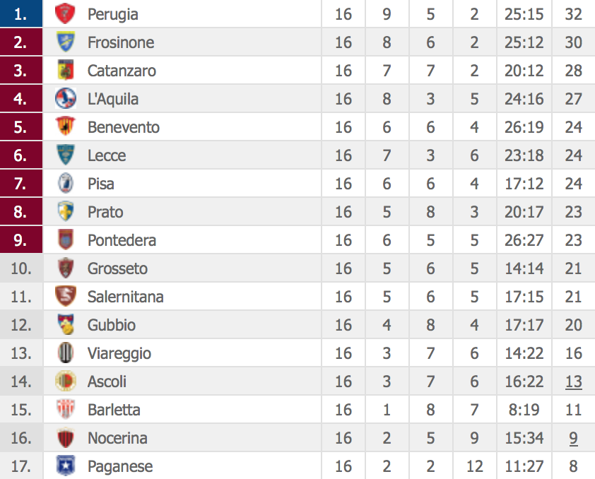 I rossoblù di Pagliari con la vittoria, e grazie ai risultati delle altre compagini, volano a ridosso del treno delle prime della classe, comandato sempre dal Perugia (1-1 col Frosinone) a 32 punti, seguita proprio dai ciociari a 30 punti. Al terzo posto i giallorossi calabresi a 28 e un punto sotto L'Aquila, che chiude così il girone d'andata al quarto posto.
