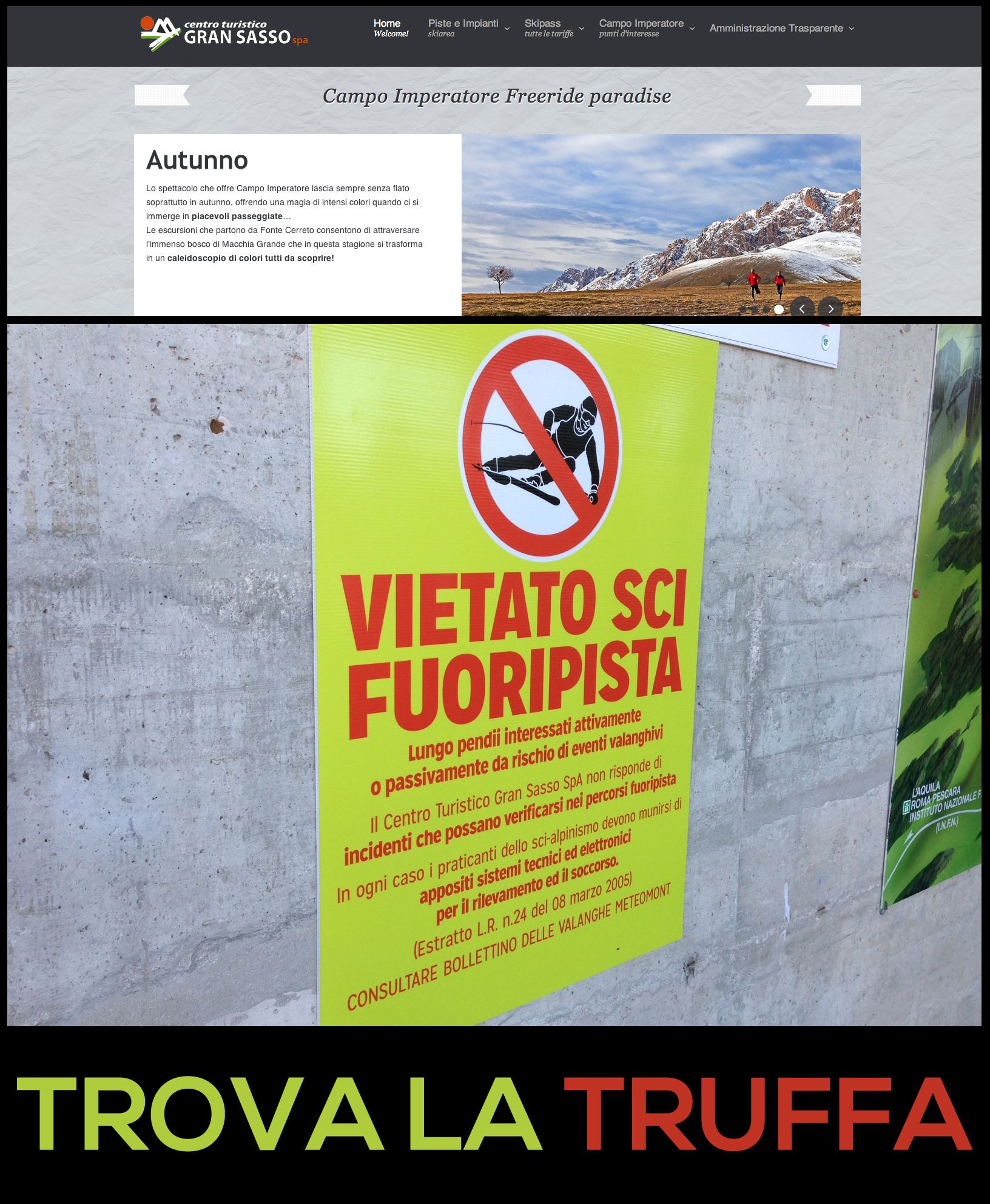 valanghe gsazLa seconda contraddizione riguarda quanto viene riportato sul sito del Centro Turistico che fa del free ride la ciliegina sula torta della sua offerta turistica: "Campo Imperatore Free ride paradise" recita il main slogan sulle pagine on line, come si può anche vedere dall'elaborazione fotografica diffusa dall'associazione Gran Sasso Anno Zero in polemica con il Comune per la mancata realizzazione degli investimenti annunciati sul Gran Sasso e per questo clamoroso passo falso del Centro Turistico sulla cultura della sicurezza in montagna.