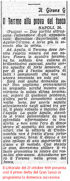 Corsi e ricorsi storici per una delle sfide più affascinanti d'Abruzzo giunta ormai alla sua 38° edizione e nuovamente in scena il 22 febbraio, nuovamente allo stadio Tommaso Fattori (e potrebbe essere l'ultimo derby disputato nell'impianto di viale Gran Sasso), nuovamente con il Teramo capolista e L'Aquila ad inseguire, come 76 anni fa.