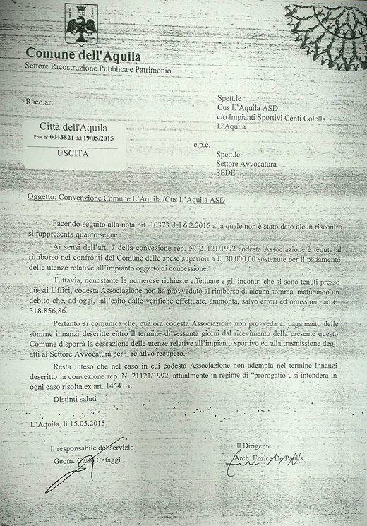 "Da anni il tariffario della convenzione non viene adeguato, mentre l'affitto per i campi aumenta - ha sottolineato polemico Gianni Padovani (Psi) - non vedo perché le convenzioni debbano essere rinnovate tacitamente, dobbiamo procedere con rapidità alla loro revisione". Il Comune dell'Aquila non vanta crediti solo con il Cus, ma anche con altre associazioni e società sportive, ma "se la condizione per rinnovare le convenzioni è l'azzeramento del debito verso il Comune, allora dobbiamo annullare i rinnovi anche con altre associazioni che soffrono comunque debiti", ha sottolineato Giorgio De Matteis (L'Aquila città aperta), difendendo il Cus e tirando fuori una lettera del 15 maggio scorso [leggi la lettera] con cui il Comune minaccia di sospendere le utenze a Centi Colella, se il Cus non provvederà a pagare i 30mila euro di debito nei confronti dell'Ente entro due mesi.