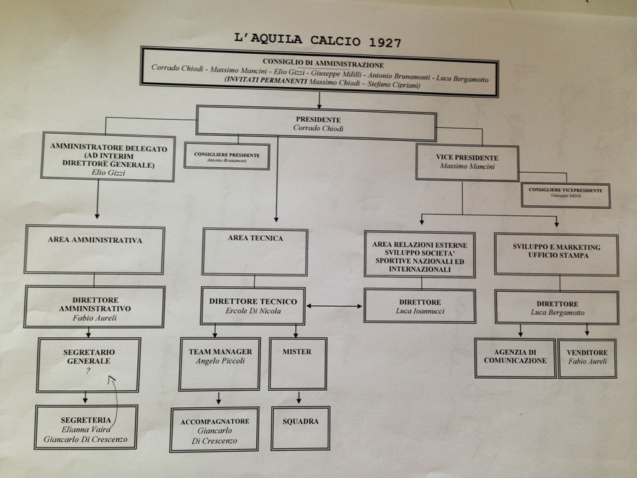 L'Aquila ha intanto presentato il nuovo organigramma societario: "abbiamo pensato di dare una logica alla società e darci dei ruoli ben definiti" afferma il Presidente Corrado Chiodi in apertura di conferenza stampa, e dallo schema elaborato si capisce quanto questa società sia conscia del salto di qualità necessario per affrontare la terza serie nazionale.