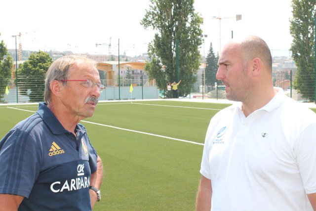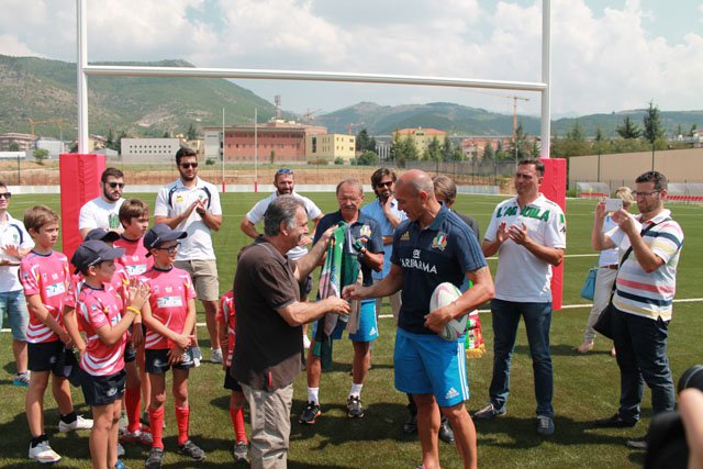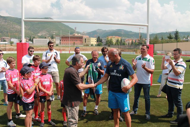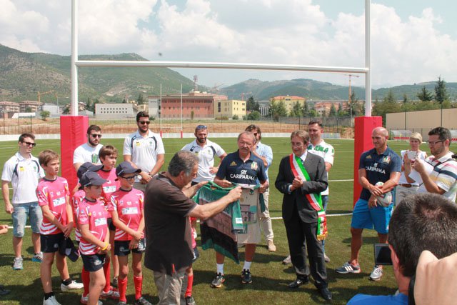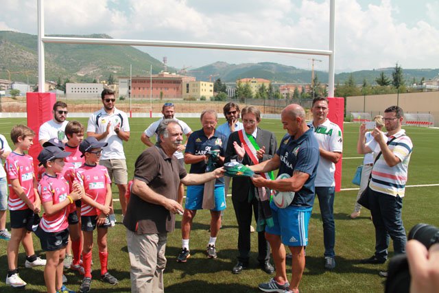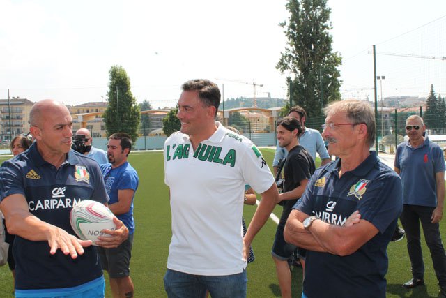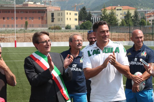 A inaugurare il nuovo campo da rugby di Piazza D'Armi c'erano, oltre al sindaco Massimo Cialente e a Mauro Zaffiri, presidente dell'Aquila Rugby Club (la società alla quale il Comune ha affidato la gestione temporanea della struttura per i primi sei mesi), anche due ospiti d'eccezione: Jacques Brunel e l'ex numero 10 neroverde Gino Troiani, rispettivamente ct e team manager della nazionale italiana, impegnata in questi giorni all'Aquila nella preparazione pre-mondiale.