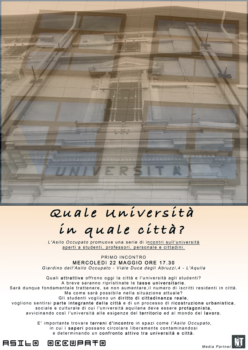Alla domanda, gli organizzatori una risposta provano a darla: “gli studenti vogliono un diritto di cittadinanza reale, vogliono sentirsi parte della città e del processo di ricostruzione, urbanistica, sociale e culturale, che allo stesso tempo può avvicinare l'università al mondo del lavoro. E' importante, allora, iniziare a trovare terreni d'incontro come lo spazio dell'Asilo in cui i saperi possano circolare liberamente, contaminandosi e realizzando un confronto attivo tra università e città”.