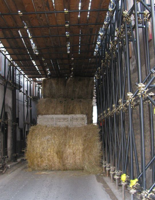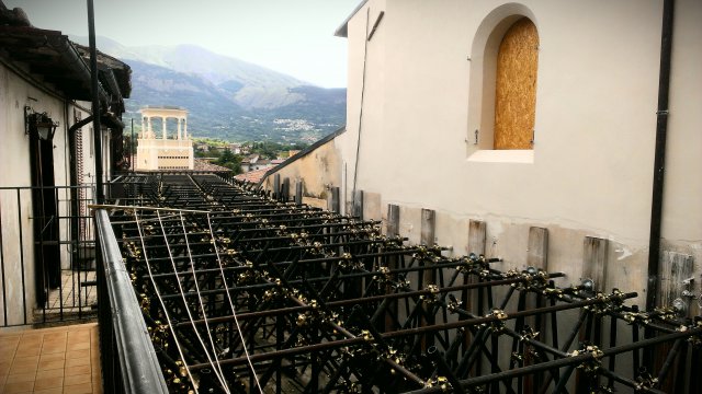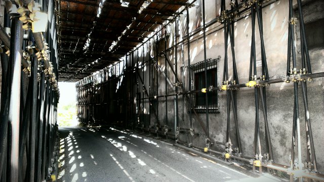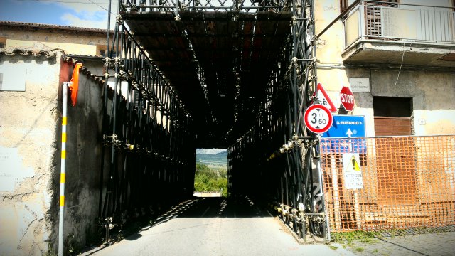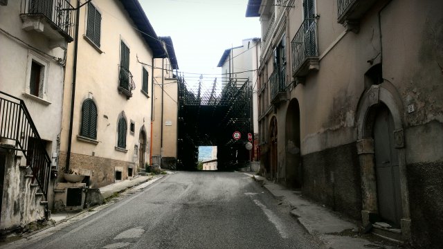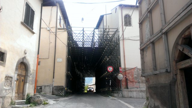 In pochissimi sanno che quell'opera di messa in sicurezza, che abbiamo sempre immaginato come necessaria alla riapertura della via – a causa, magari, dell'inagibilità e conseguente pericolo crollo degli edifici ai due lati della strada – è un puntellamento che, secondo le intenzioni della Protezione Civile, servirebbe a riparare i mezzi dall'eventuale caduta di oggetti dall'alto. Sembra uno scherzo, ma è così: quel puntellamento non ha funzioni di contenimento strutturale (cioè non "spinge" gli edifici ai lati della strada), ma è una sorta di ponte per riparare l'eventuale caduta di tegole, comignoli e altri oggetti.
