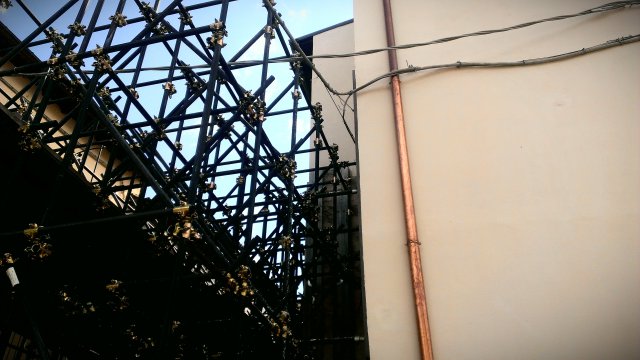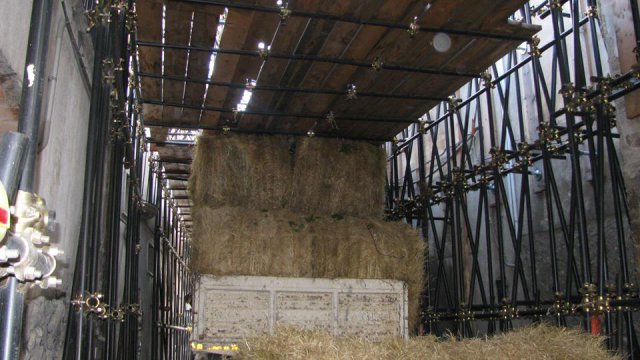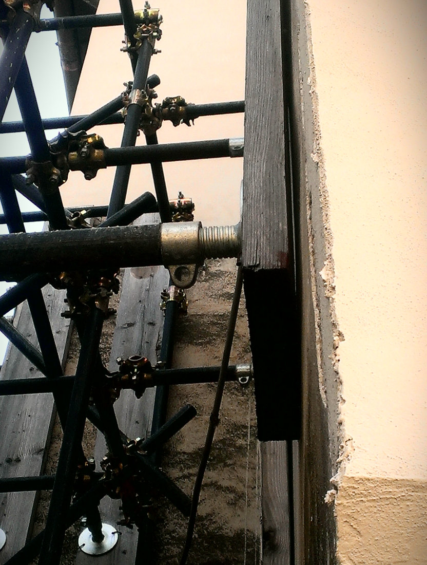 Il puntellamento di tubi e giunti neri, dunque, non servirebbe a reggere nessun edificio che affaccia sulla strada. Ne è una dimostrazione il fatto che le barre di legno che poggiano sulle pareti della chiesa sono staccate almeno tre centimetri dal muro, e rimangono appese solo perché affisse da chiodi [foto a destra, clicca per ingrandirla]. Ma come può esserci ancora pericolo per la caduta di oggetti dall'alto, se gran parte degli edifici che affacciano sulla via sono agibili? E, soprattutto, è necessaria una opera di messa in sicurezza così invadente e imponente per la caduta di oggetti che si sarebbe potuta risolvere anni fa, con un ordinario intervento di rimozione di tegole e oggetti pericolosi?