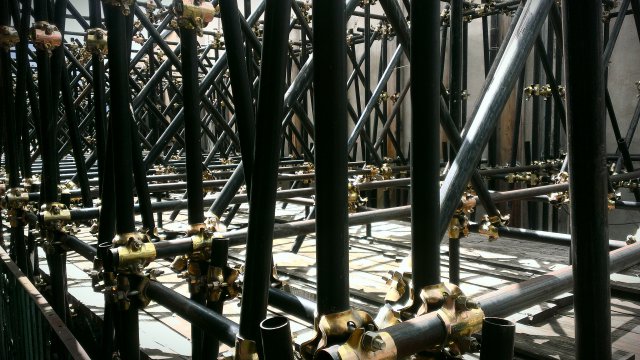 Ma chi esegue la manutenzione di un puntellamento così imponente? Nessuno, e infatti i bulloni dei numerosissimi giunti, ad esempio, nell'arco degli anni – a causa di sole, pioggia, neve – si sono svitati e, non di rado, cadono sulla base del ponteggio o addirittura in strada [foto in basso, clicca per ingrandirla].